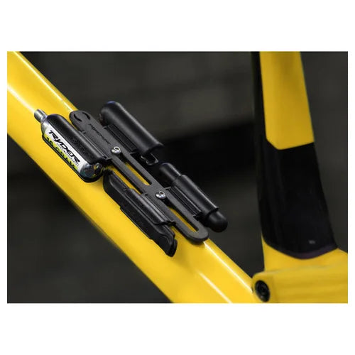 The Slyder 4-Up fits 2 CO2 cartridges, a Nutcracker, tyre levers, and a Slugplug, offering a comprehensive storage solution for your cycling essentials.