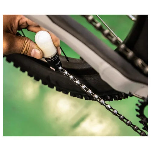 Its silicone chain guide, equipped with dirt-removing fins, not only applies the lube but also helps in keeping the chain clean, enhancing its performance and lifespan.